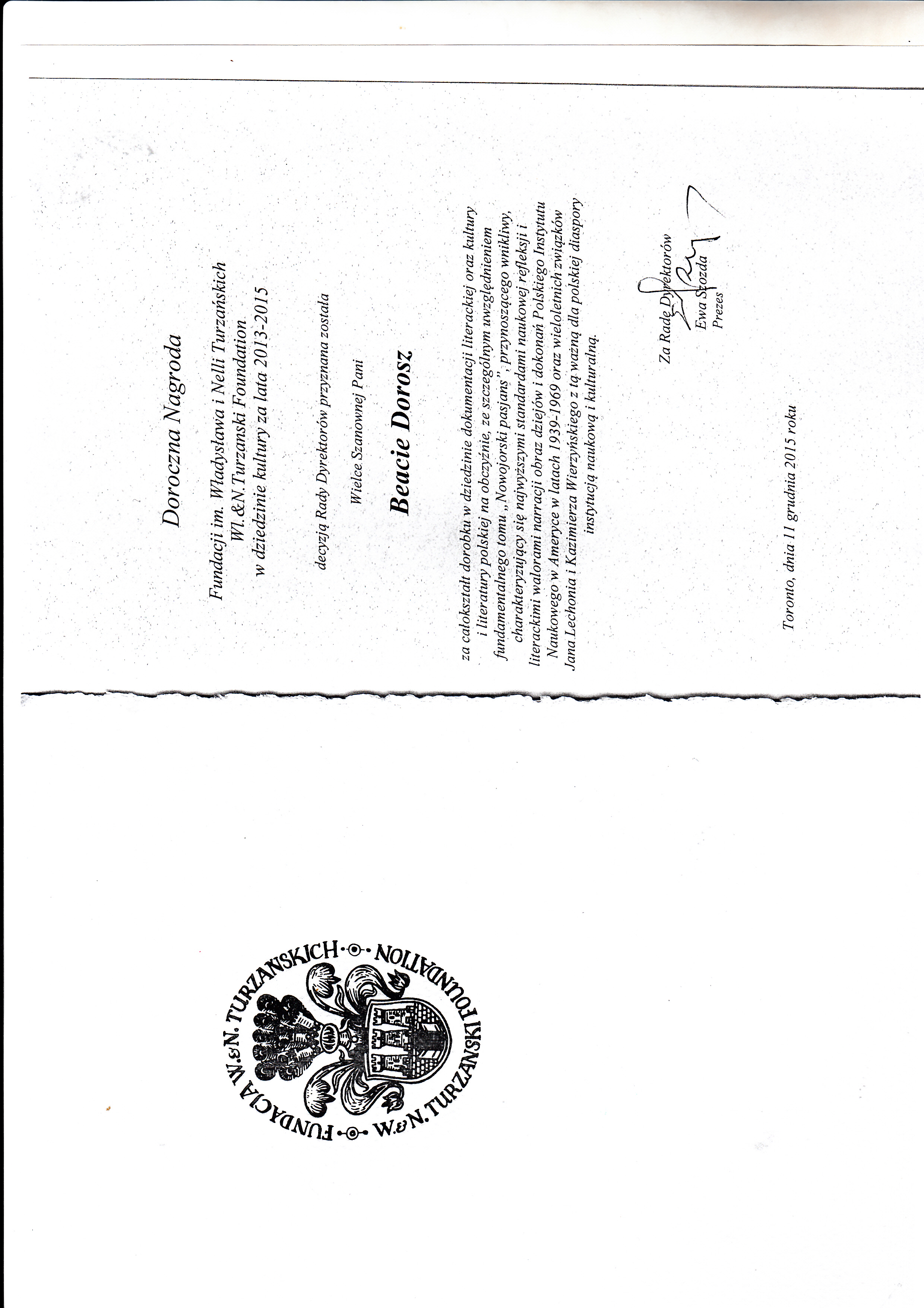 Doroczna Nagroda Fundacji im. Władysława i Nelli Turzańskich Wl.&N.Turzanski Foundation w dziedzinie kultury za lata 2013-2015 została przyznana Pani Profesor Beacie Dorosz.