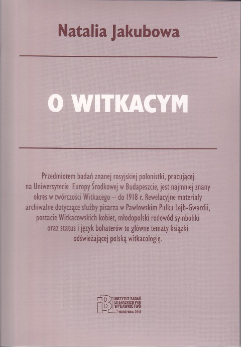 Przedmiotem badań znanej rosyjskiej polonistki, pracującej na Uniwersytecie Europy Środkowej w Budapeszcie, jest najmniej znany okres w twórczości Witkacego - do 1918 r. Rewelacyjne materiały archiwalne dotyczące służby pisarza w Pawłowskim Pułku Lejb-Gwardii, postacie Witkacowskich kobiet, młodopolski rodowód symboliki oraz status i język bohaterów to główne tematy książki odświeżającej polską witkacologię.